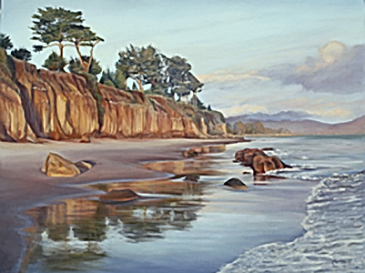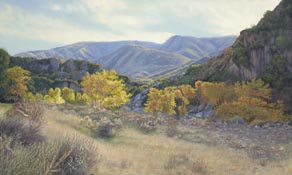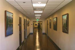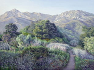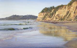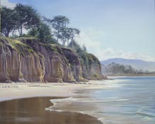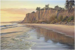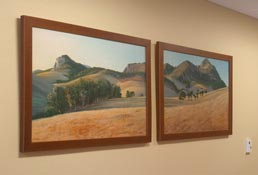 Along with hundreds of other Santa Barbara artists, I responded to a "Call for Artists" for the Cottage Hospital Healing Arts program. Several months after I submitted my work to the company managing the project, Aesthetics Inc. I received a request to do a second submittal for the 8' x 23' art niches located 19' above the floor of the Main Lobby of the hospital. The only guidelines were to provide "Iconic images of Santa Barbara" that would be in keeping with the concept of Healing Arts. Bill and I combed the whole Santa Barbara area from Casino Silo to the Harbor and the beaches. We found two views that inspired these murals. A view across Santa Barbara's West side over State Street and the Riviera to the Santa Ynez Mountains glowing in warm winter evening light became "Peace, A Quiet Evening". For the other Triptych we went to the end of Mission Creek at the ocean near Stern's Wharf. We chose a bright, fresh (and chilly) early morning after a storm for "Hope, A New Day". I painted two 5 foot long "maquette" paintings while Bill did CAD drawings showing the construction and scale of the Triptychs to complete the submittal. Weeks later we were very pleased to find out I had been awarded the commission. Then reality set in and we began 10 months of work to complete what was by far the biggest art project I've ever even considered. After we installed the paintings on December 9, 2011 I spent the next several weeks hibernating. In 2012 we worked on Limited Edition Archival Canvas Prints of these Triptychs in sizes from 20" x 60" to 40" x 120". These are on display at Corridan Gallery